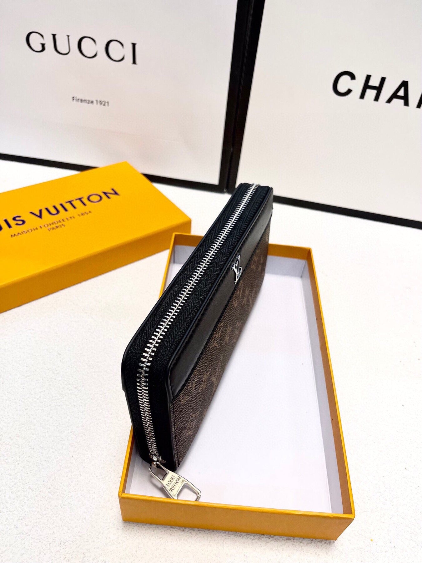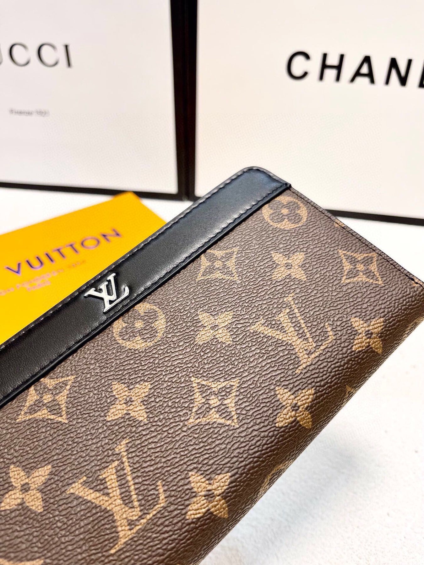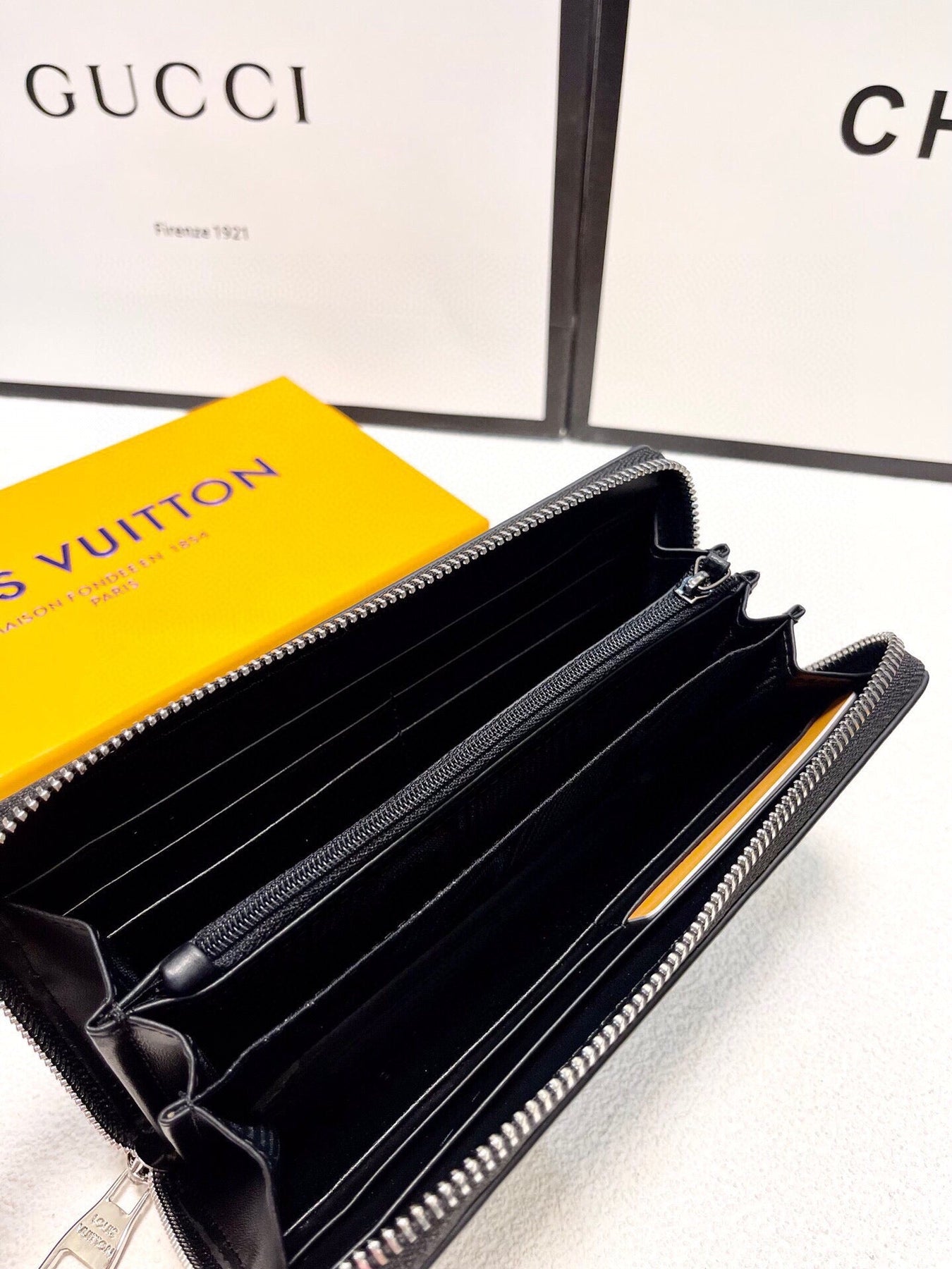 Features several corner compartments, pockets and card slots.
